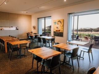 Owner Angela Wood runs the kitchen at the Ridge Café, offering a relaxed atmosphere and a changing sharing menu. Angela is an artist and displays her collection at cellar door and created the Estate labels inspired by her Colour Theory art series.